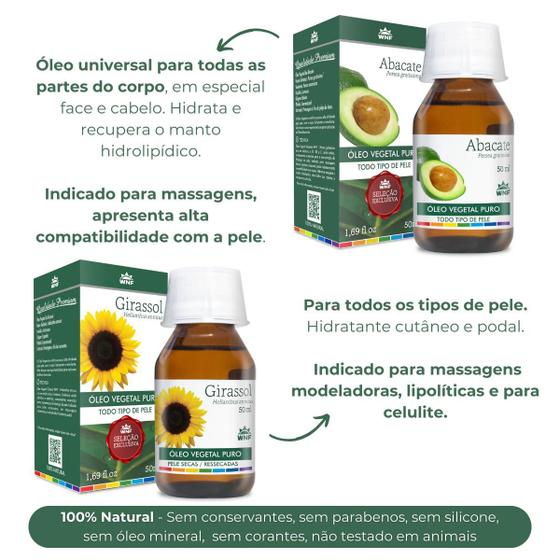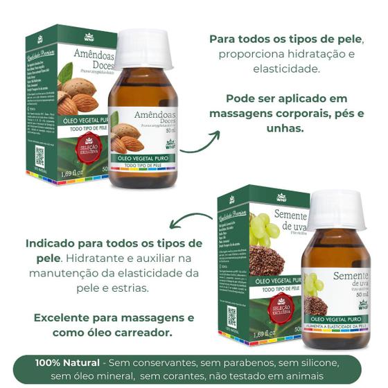 ÓLEO DE SEMENTE DE UVA: O óleo de semente de uva é um produto produzido a partir da prensagem a frio das sementes de uva que sobram durante a produção do vinho. Rico em ácidos graxos como Ômegas 3, 6, e 9. Tem uma grande quantidade de compostos fenólicos com grande potencial antioxidante como flavonoides, carotenoides, ácidos fenólicos, taninos e estilbeno e também tocoferol ou vitamina E, resveratrol que são poderosos antioxidantes e atuam contra a ação dos radicais livres e também possui vitamina C e D. Suas propriedades são: antioxidante, rejuvenescedora, antienvelhecimento, cicatrizante, anti-inflamatória, nutritiva e antimicrobiana.